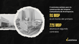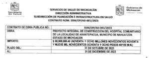 En ese año, los Servicios de Salud de Michoacán adjudicaron de manera directa el contrato número SSM/OP/AD-001/2023 para la construcción del Hospital Comunitario de Arantepacua por un monto de 98 millones 999 mil 988 pesos .