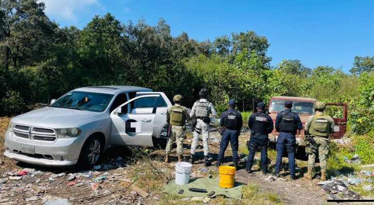 Fue en un camino carretero al norte del municipio donde los elementos de la Guardia Civil, el Ejército Mexicano, la Guardia Nacional y la Policía local, encontraron en aparente estado de abandono dos camionetas de las marcas Jeep y Dodge con leyendas alusivas a un grupo delictivo; al verificar sus datos se pudo constatar que una de ellas tiene reporte de robo.