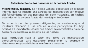 “Esta institución lleva a cabo los actos de investigación correspondientes para esclarecer plenamente lo ocurrido y determinar responsabilidades conforme a derecho”, señaló la Fiscalía tabasqueña.