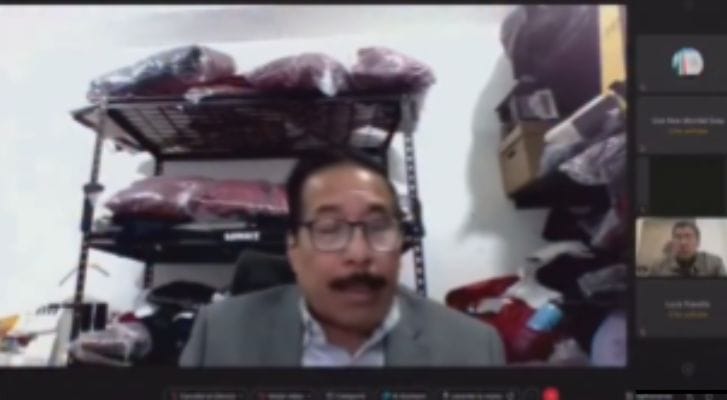 Ciudad de México.– En medio de chalecos, gorras y mochilas color guinda, el candidato a magistrado por Tamaulipas, Ángel Ávila Rodríguez, realizó su comparecencia ante el Senado de la República de forma remota, desde lo que aparenta ser una bodega con artículos del partido Morena.
