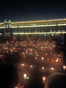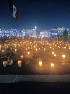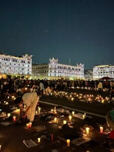 Morelia, Michoacán, a 16 de marzo de 2025.- En la protesta, se le rindió un homenaje a las 400 personas asesinados en el campo de exterminio con el encendido de 400 veladoras y la colocación de 400 pares de zapatos.