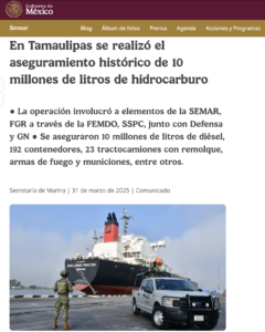 Morelia, Michoacán, a 29 de abril de 2025.- El pasado 31 de marzo, la Secretaría de Marina (Semar) anunció un “aseguramiento histórico” de huachicol en el puerto de Tampico, Tamaulipas, tras un operativo conjunto con la Fiscalía General de la República (FGR), la Secretaría de la Defensa Nacional (Sedena) y la Secretaría de Seguridad y Protección Ciudadana (SSPC). De acuerdo con el comunicado oficial, se aseguraron 10 millones de litros de diésel ilegal.