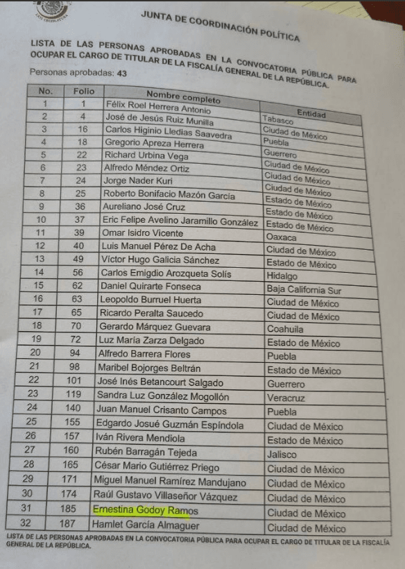Además de Ernestina Godoy, la lista incluye a las aspirantes Luz María Zarza Delgado, Sandra Luz González Mogollón y Maribel Bojorges Beltrán, quienes también cumplieron con los requisitos para contender por la titularidad de la FGR.