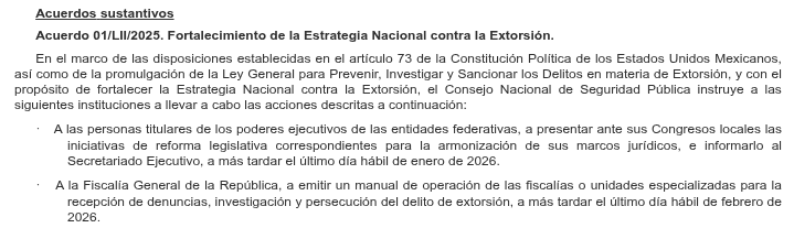 En dicho acuerdo se establece el “fortalecimiento” de la Estrategia Nacional contra la Extorsión, la cual entrará formalmente en operación a partir de 2026 y tendrá carácter obligatorio para las entidades federativas.