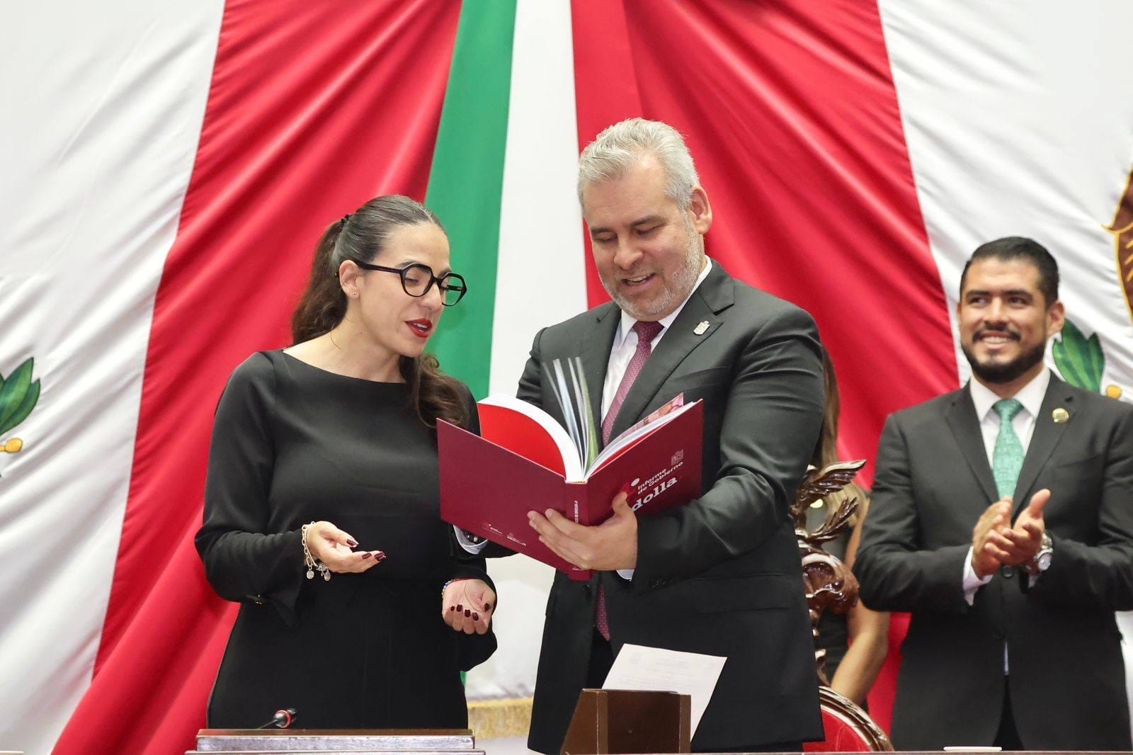 Morelia, Michoacán, a 25 de septiembre.- El gobernador Alfredo Ramírez Bedolla durante la rendición de su Cuarto Informe de Gobierno en el Congreso de Michoacán dijo que sólo está siguiendo los pasos de la presidenta Claudia Sheinbaum, al hablar de los teleféricos iniciados en Uruapan y Morelia.