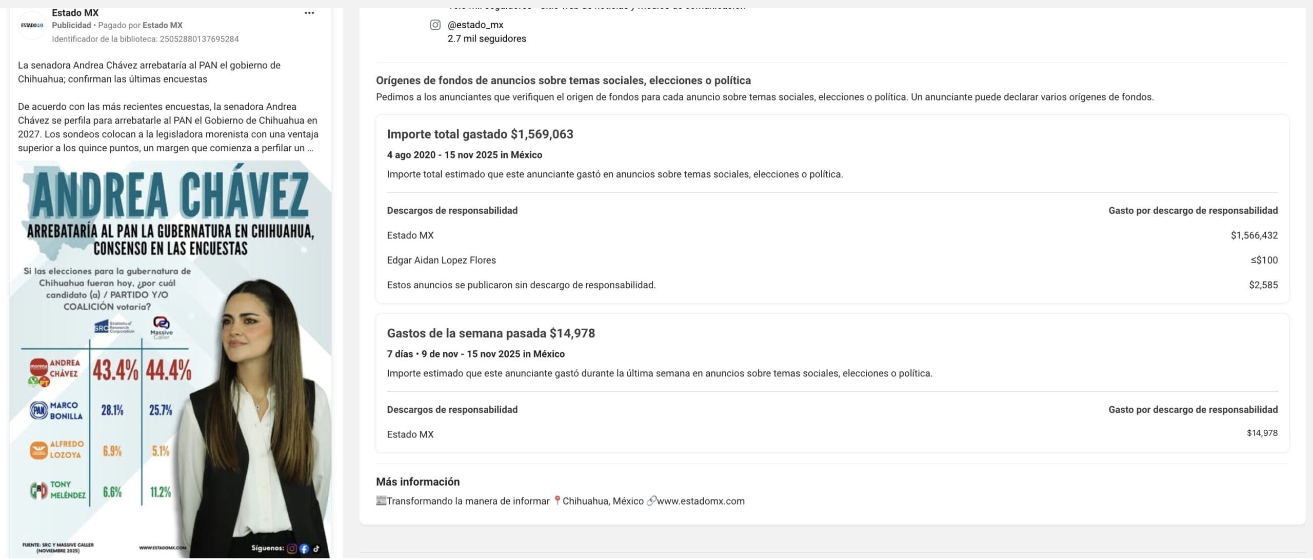 “Un medio llamado “Estado Mx” ha gastado más de 1 millón y medio de pasos en anuncios de facebook a favor de la senadora de Morena Andrea Chávez. La mayoría son encuestas y promoción personalizada de ella, ¿Quién paga estas encuestas y de Dónde sale el dinero?”, mencionó el reportero en su cuenta, acompañando el texto con una captura de pantalla de la biblioteca de anuncios de Meta.