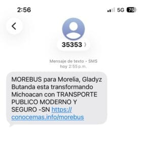 Uno de los mensajes enviados por SMS menciona de forma directa a Gladyz Butanda y la relaciona con un proyecto de transporte en la capital michoacana. El texto señala:
