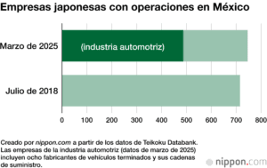 Según datos de Teikoku Databank, en marzo de 2025 operaban en México 746 empresas japonesas en diversos sectores, representando un incremento del 31% respecto a julio de 2018. De estas, 487 están vinculadas a la industria automotriz, incluyendo 8 fabricantes de vehículos y sus cadenas de suministro.