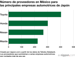 De las empresas automotrices japonesas en México, 404 suministran piezas a Toyota, representando más de la mitad del total. Esta concentración subraya la importancia de Toyota en la industria automotriz mexicana y la magnitud del impacto que los aranceles podrían tener en su cadena de suministro.