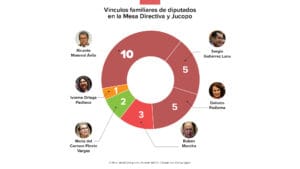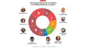Un análisis de la organización Mexicanos Contra la Corrupción y la Impunidad (MCCI) revela que, de los 37 legisladores que integran la Mesa Directiva y la Junta de Coordinación Política de ambas Cámaras, al menos 15 tienen un familiar que ha ocupado un cargo público en el último año. En total, se identificaron 45 relaciones familiares con funcionarios en ejercicio. Además, el 14% de los legisladores en estos órganos de gobierno tienen un familiar que también ocupa una curul en alguna de las dos Cámaras federales.